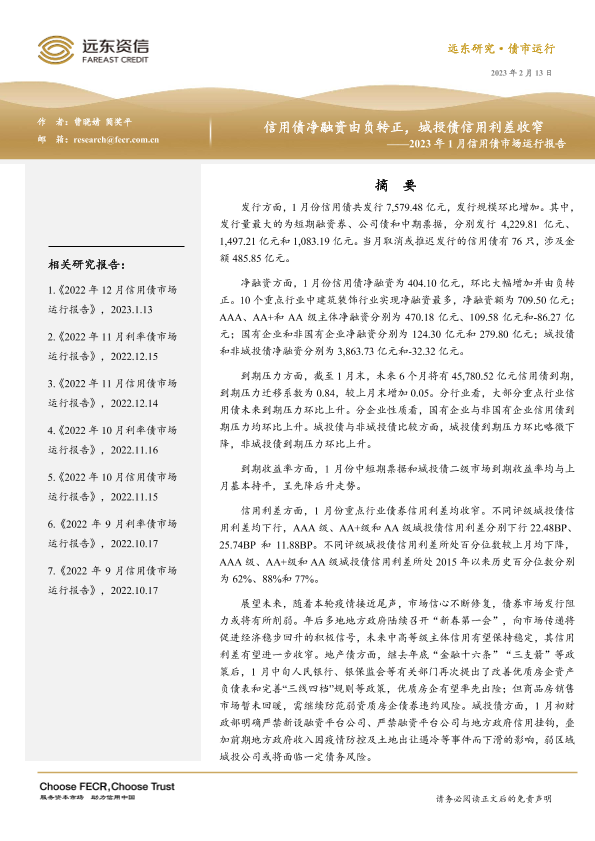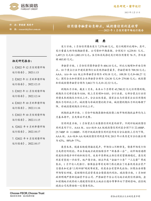 【远东资信】【20230213】2023年1月份信用债市场运行报告:信用债净融资由负转正,城投债信用利差收窄-20页