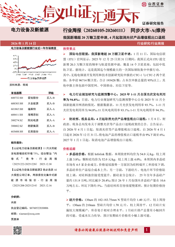【山西证券】【202601】行业周报(20260105-20260111)同步大市-A(维持)我国新增超 20万颗卫星申请,4月起取消光伏产品增值税出口退税-4页