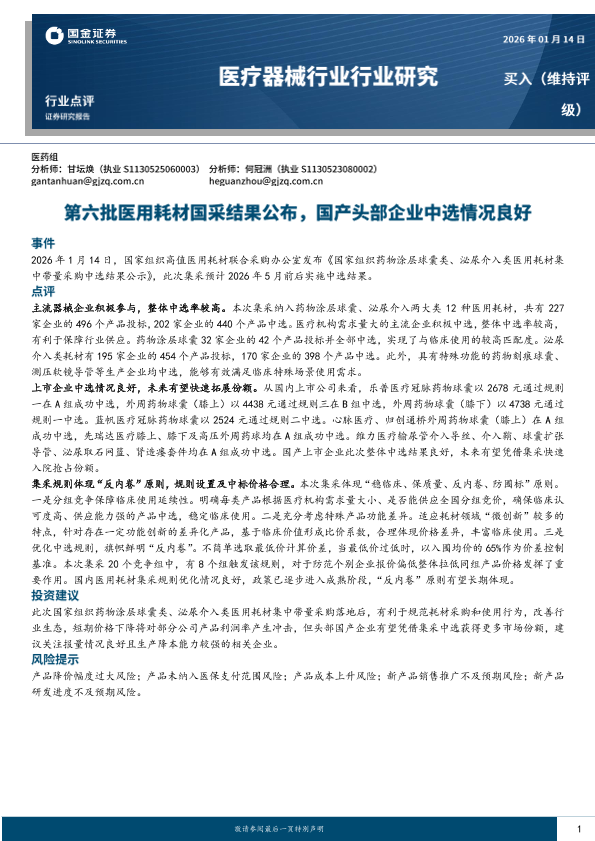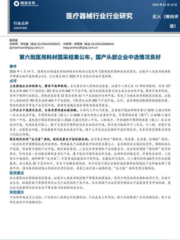 【国金证券】【202601】医疗器械行业行业研究:第六批医用耗材国采结果公布,国产头部企业中选情况良好-3页