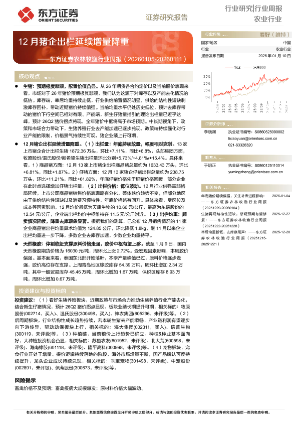 【东方证券】【202601】东方证券农林牧渔行业周报(-20260111):12月猪企出栏延续增量降重-16页