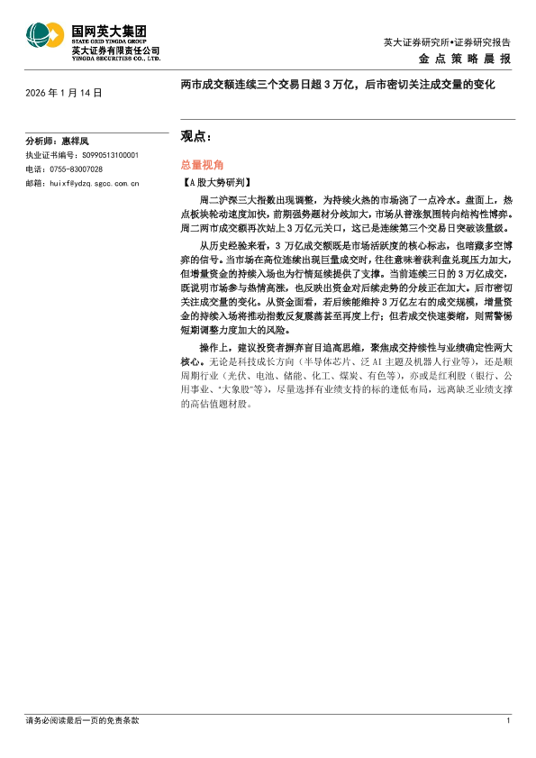 【英大证券】【202601】金点策略晨报:两市成交额连续三个交易日超3万亿,后市密切关注成交量的变化-4页