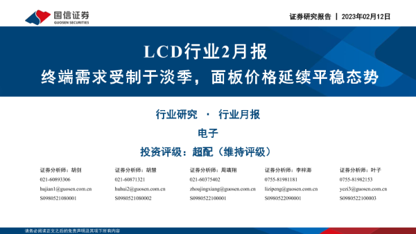 【国信证券】【20230212】LCD行业2月报:终端需求受制于淡季,面板价格延续平稳态势-24页