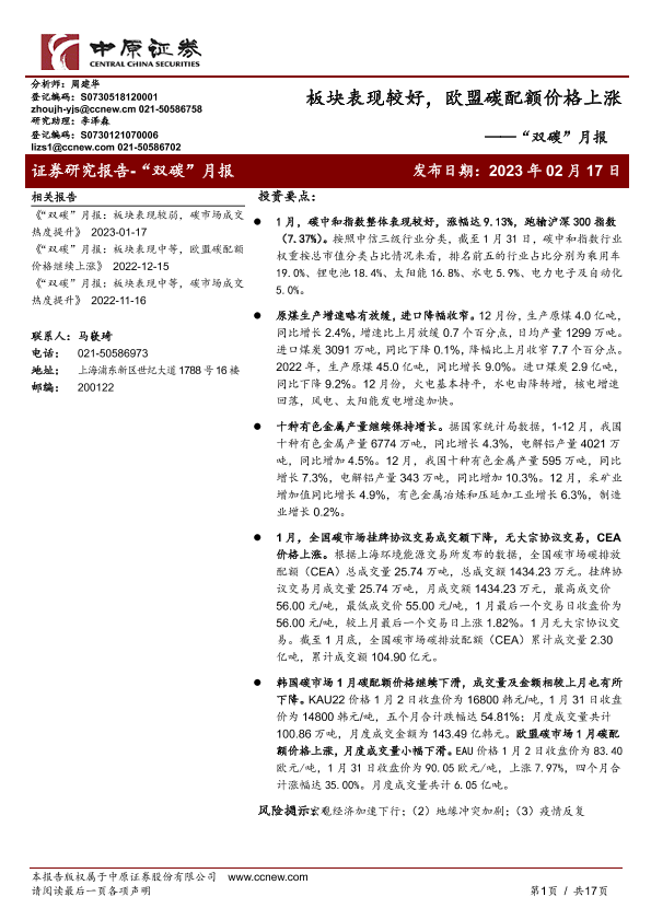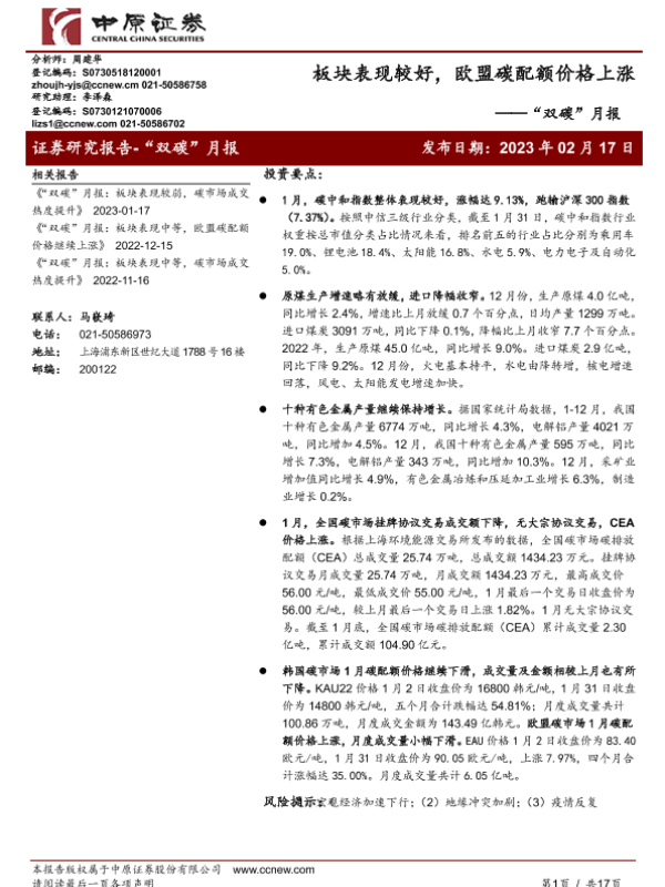 【中原证券】【20230217】“双碳”月报:板块表现较好,欧盟碳配额价格上涨-17页