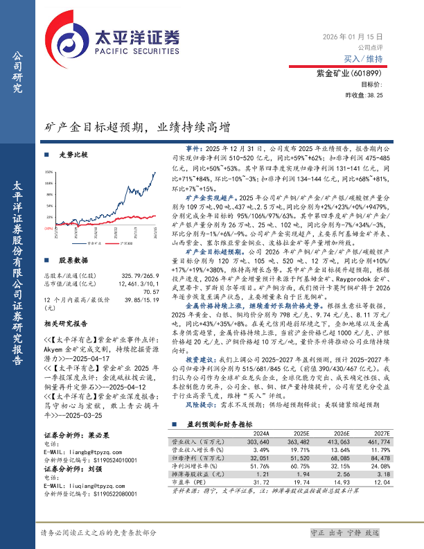 投资评级 有色金属 矿产金 业绩增长 紫金矿业