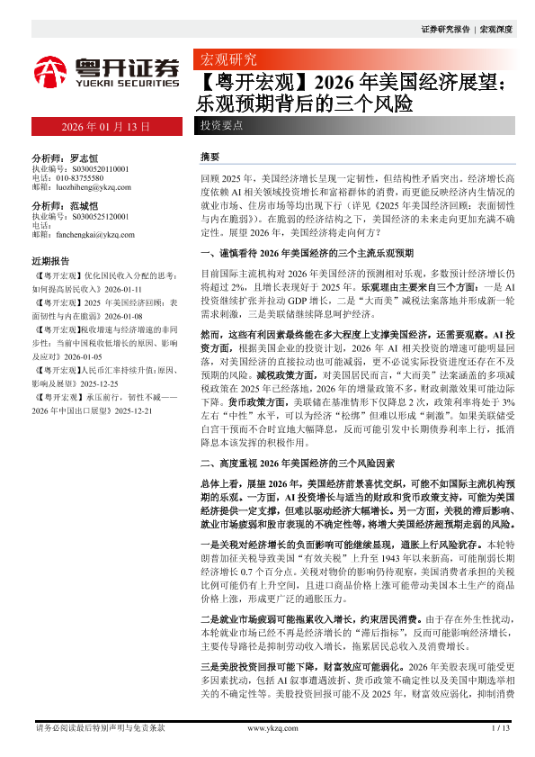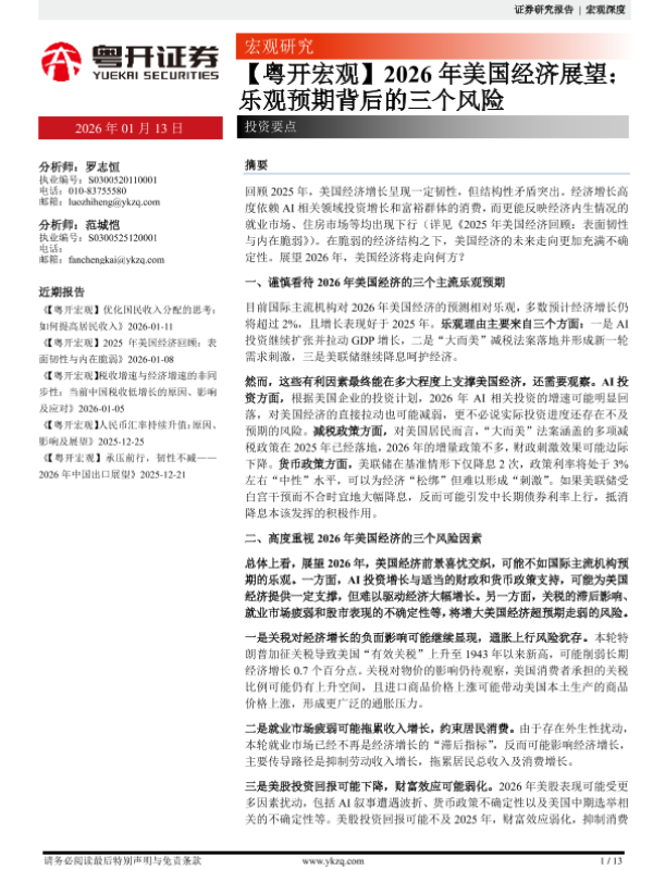 【粤开证券】【202601】2026年美国经济展望:乐观预期背后的三个风险-13页
