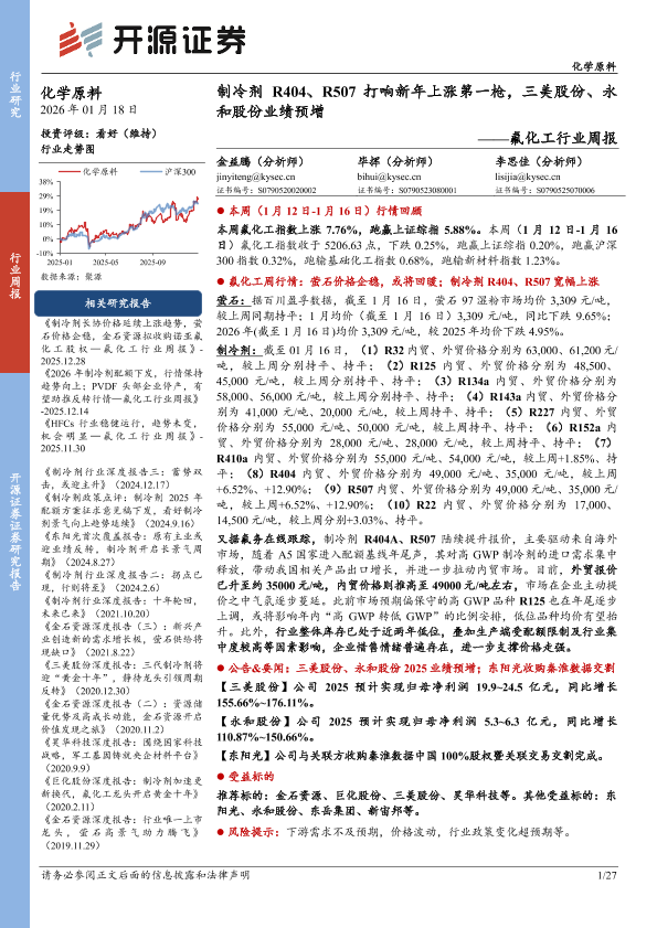 【开源证券】【202601】氟化工行业周报:制冷剂R404、R507打响新年上涨第一枪,三美股份、永和股份业绩预增-27页