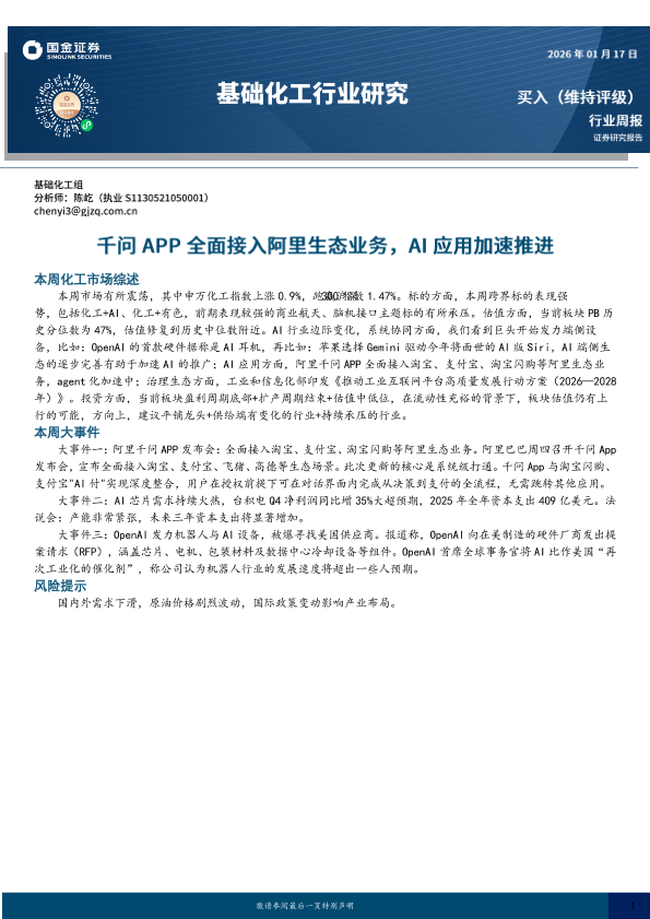 AI应用 估值修复 基础化工 行业周报 产品价格分析