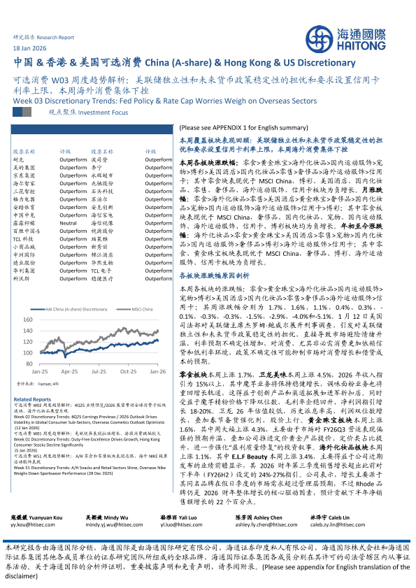 【海通国际】【202601】中国&香港&美国可选消费 W03周度趋势解析:美联储独立性和未来货币政策稳定性的担忧和要求设置信用卡利率上限,本周海外消费集体下挫-16页
