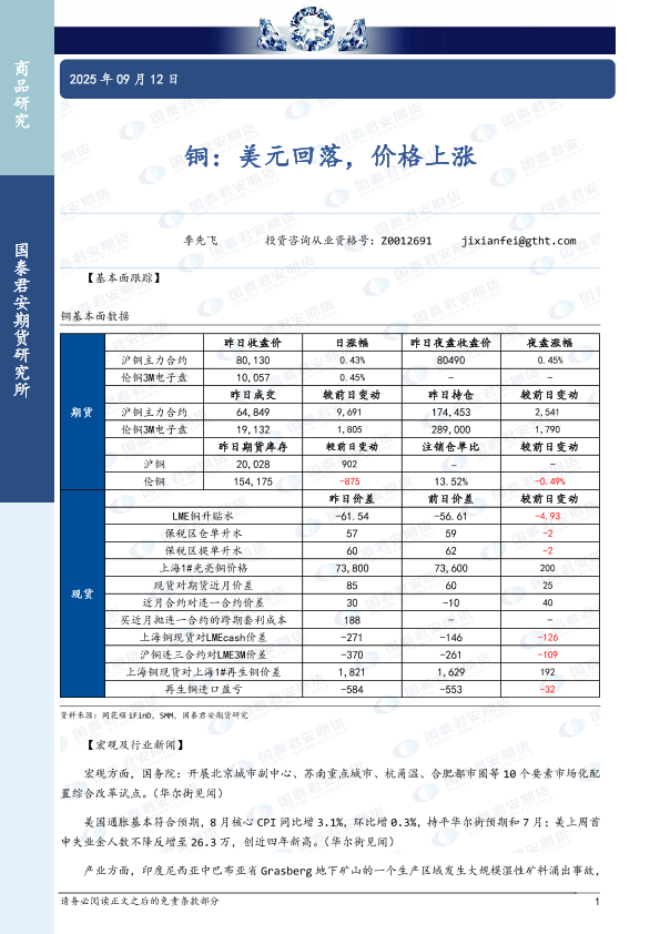 【国泰君安期货】【202509】铜:美元回落,价格上涨-3页