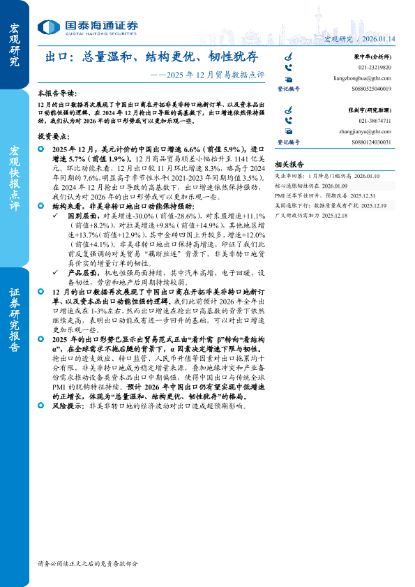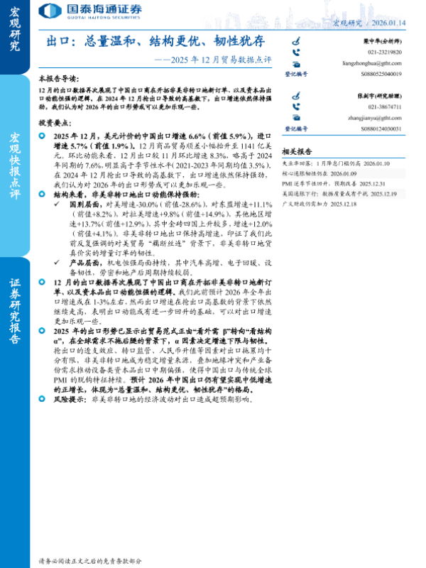 【国泰海通证券】【2025】出口:总量温和、结构更优、韧性犹存——2025年12月贸易数据点评-7页