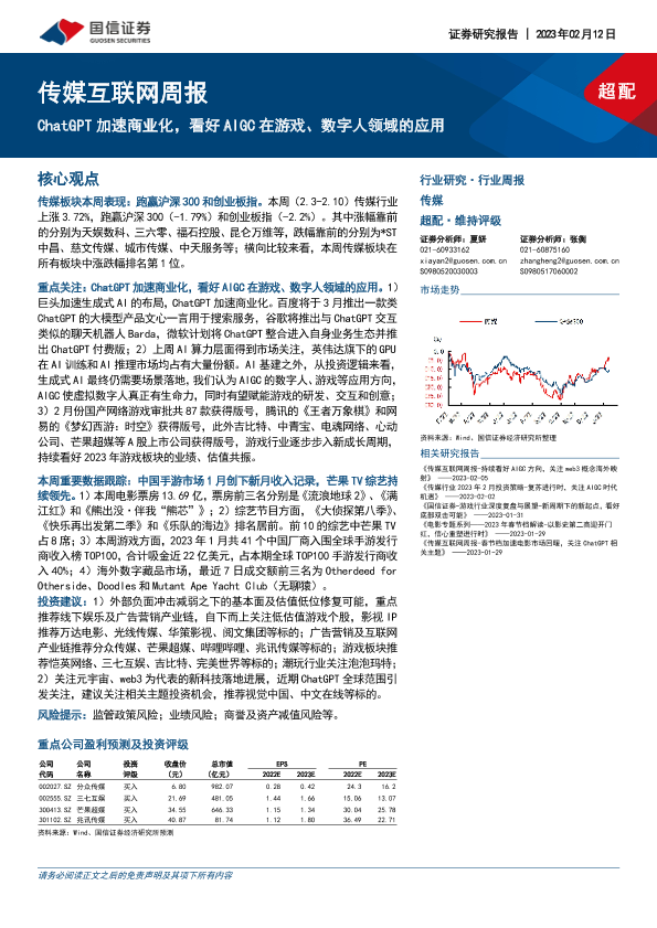 【国信证券】【20230212】传媒互联网周报:ChatGPT加速商业化,看好AIGC在游戏、数字人领域的应用-25页