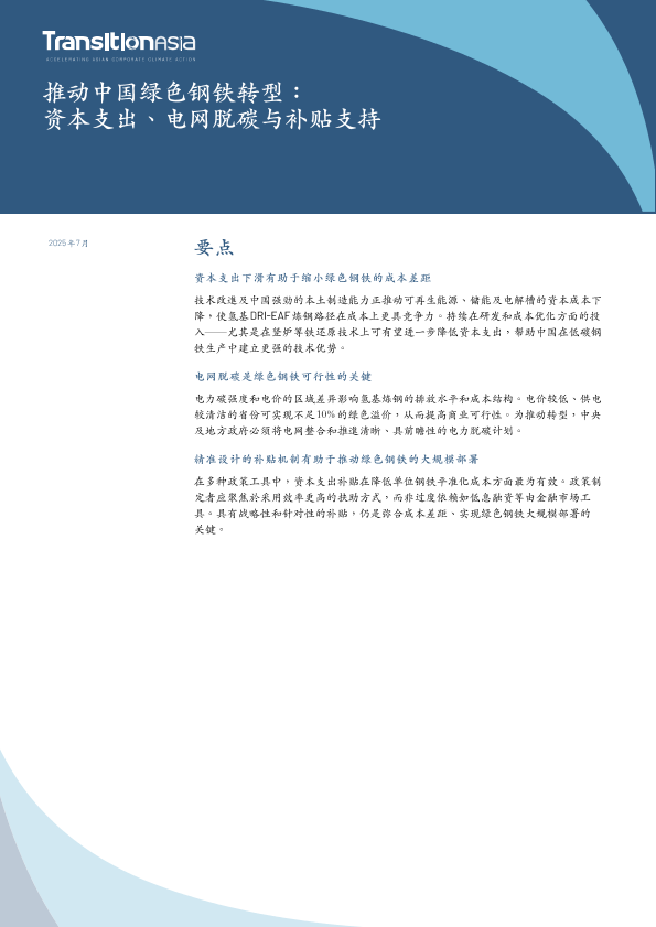 【气候转型亚洲(Transition Asia)】【202507】推动中国绿色钢铁转型 资本支出、电网脱碳与补贴支持-14页