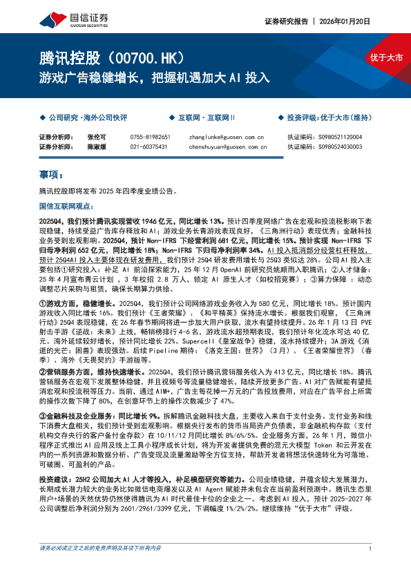 网络广告 投资评级 AI投入 游戏业务 腾讯控股