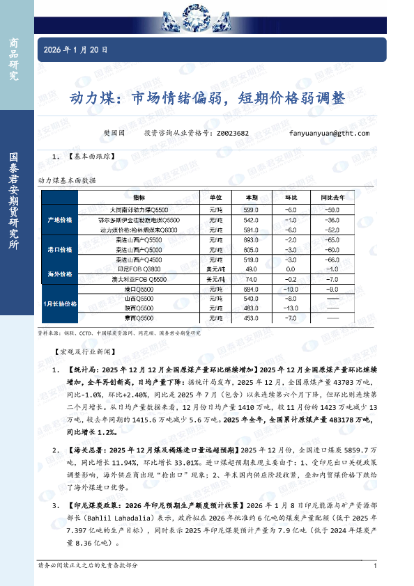 【国泰君安期货】【202601】叨力煤:市场情绪偏弱,短期价格弱调整-2页