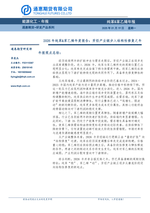 【通惠期货研发部】【202501】2026年纯苯&苯乙烯年度报告:芳烃产业链步入结构性修复之年-22页