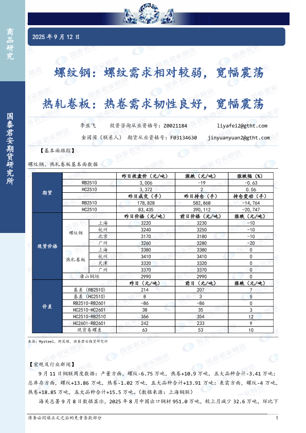 【国泰君安期货】【202509】螺纹钢:螺纹需求相对较弱,宽幅震荡 热轧卷板:热卷需求韧性良好,宽幅震荡-3页