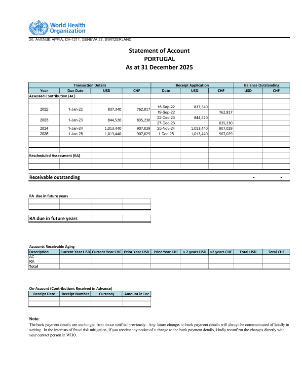 【世界卫生组织】【2025】Statement of Account PORTUGAL As at 31 December 2025-1页