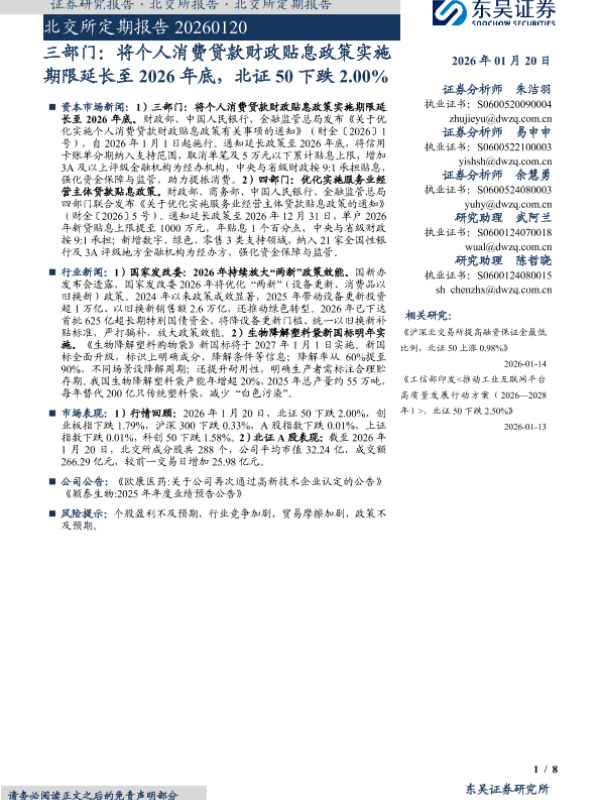 【东吴证券】【202601】三部门:将个人消费贷款财政贴息政策实施期限延长至2026年底,北证50下跌2.00%-8页