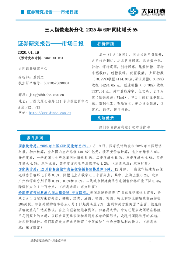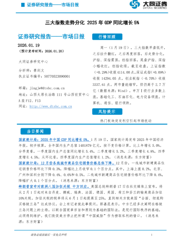 【大同证券研究中心】【202601】市场日报:三大指数走势分化 2025年GDP同比增长5%-5页