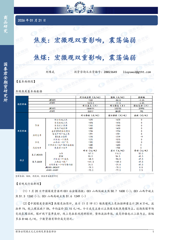 【国泰君安期货】【202601】焦炭:宏微观双重影响,震荡偏弱,焦煤:宏微观双重影响,震荡偏弱-3页