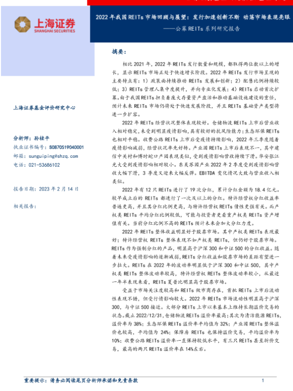 【上海证券】【20230214】公募REITs系列研究报告:2022年我国REITs市场回顾与展望,发行加速创新不断,动荡市场表现亮眼-18页