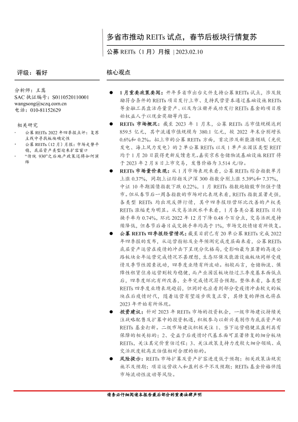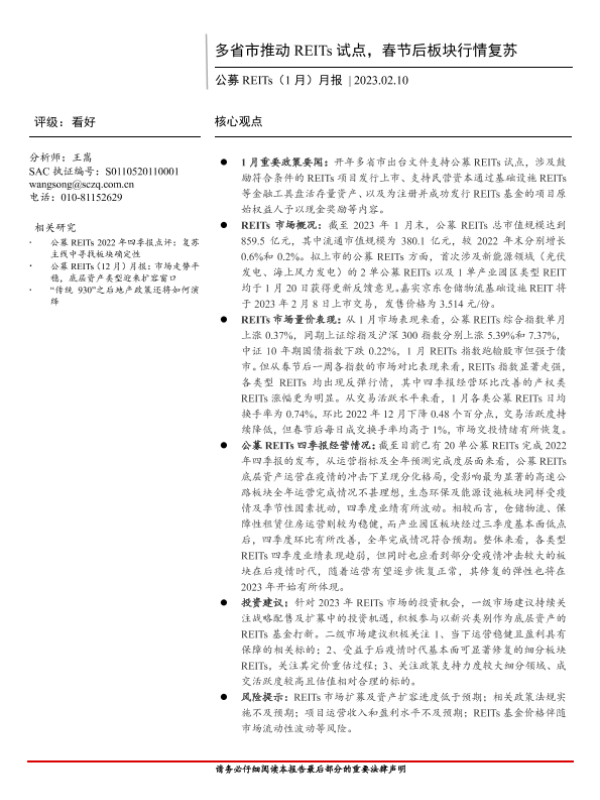 【首创证券】【20230210】公募REITs(1月)月报:多省市推动REITs试点,春节后板块行情复苏-15页