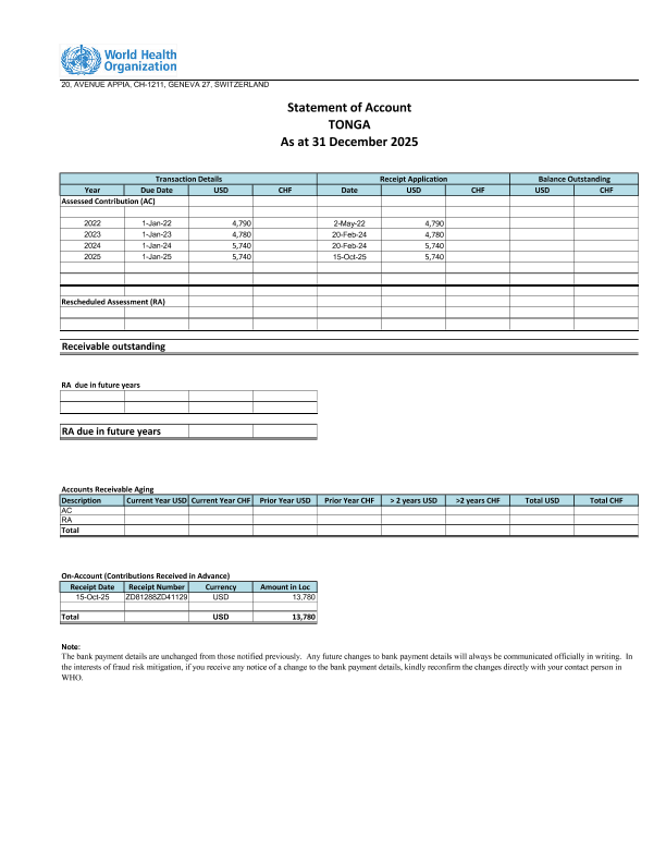 【世界卫生组织】【2025】Statement of Account TONGA As at 31 December 2025-1页