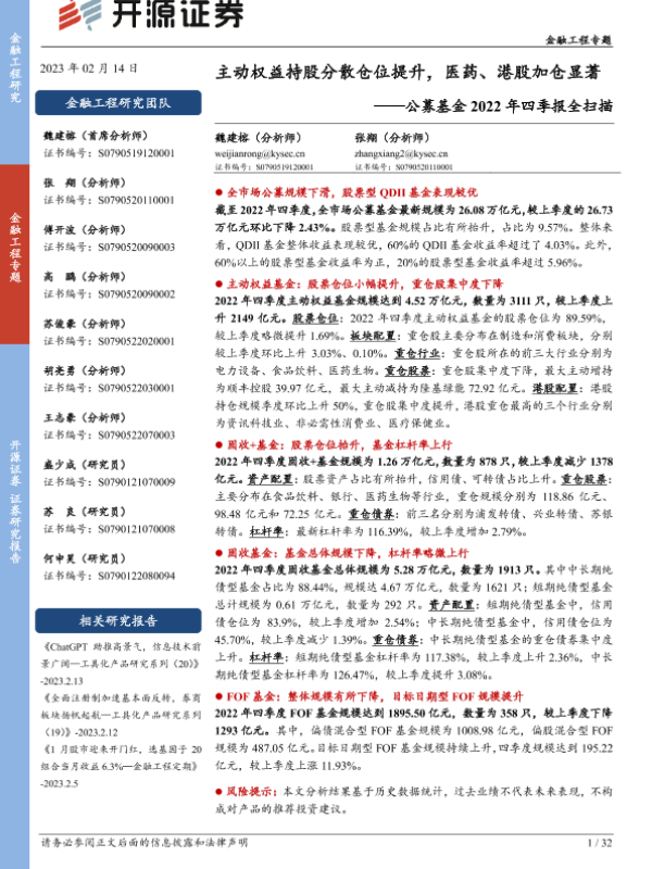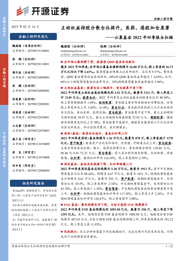 【开源证券】【20230214】公募基金2022年四季报全扫描:主动权益持股分散仓位提升,医药、港股加仓显著-32页