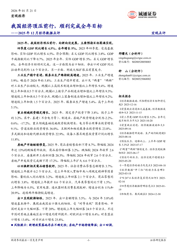 【诚通证券】【202512】2025年12月经济数据点评:我国经济顶压前行,顺利完成全年目标-15页