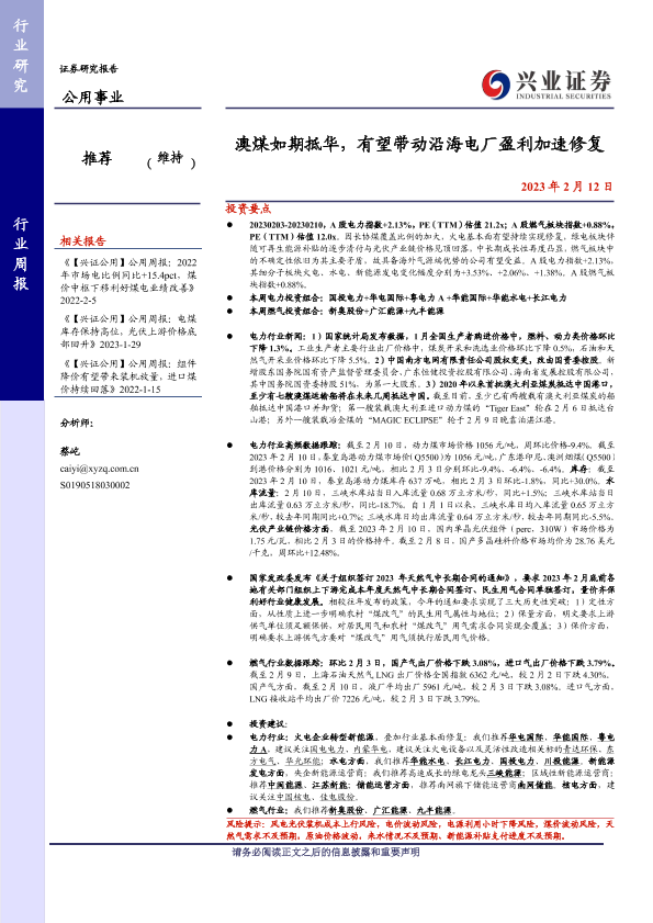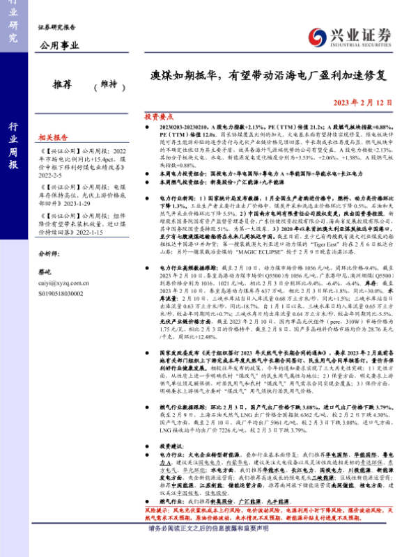 【兴业证券】【20230212】公用事业行业周报:澳煤如期抵华,有望带动沿海电厂盈利加速修复-22页