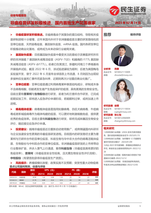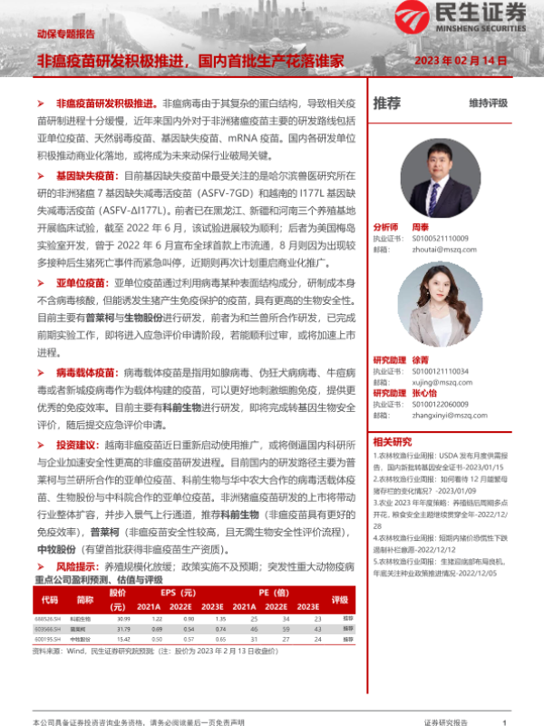【民生证券】【20230214】农林牧渔行业动保专题报告:非瘟疫苗研发积极推进,国内首批生产花落谁家-16页