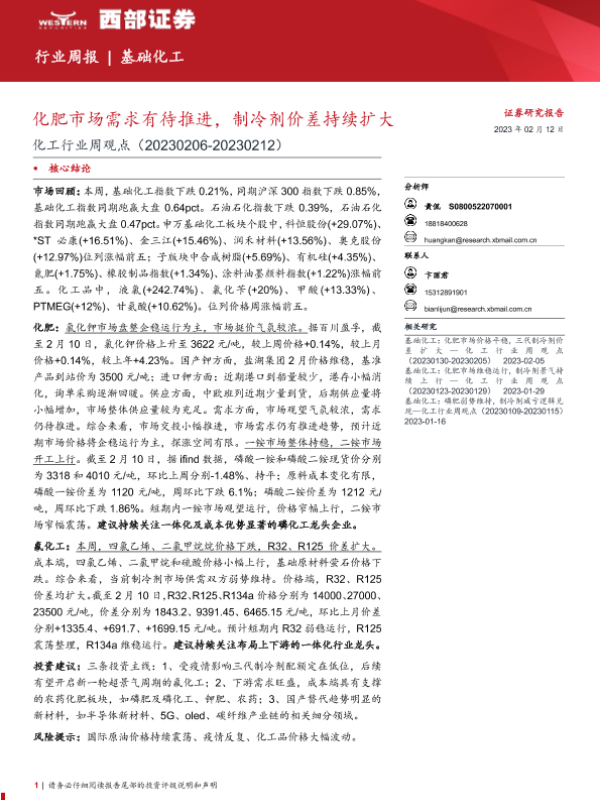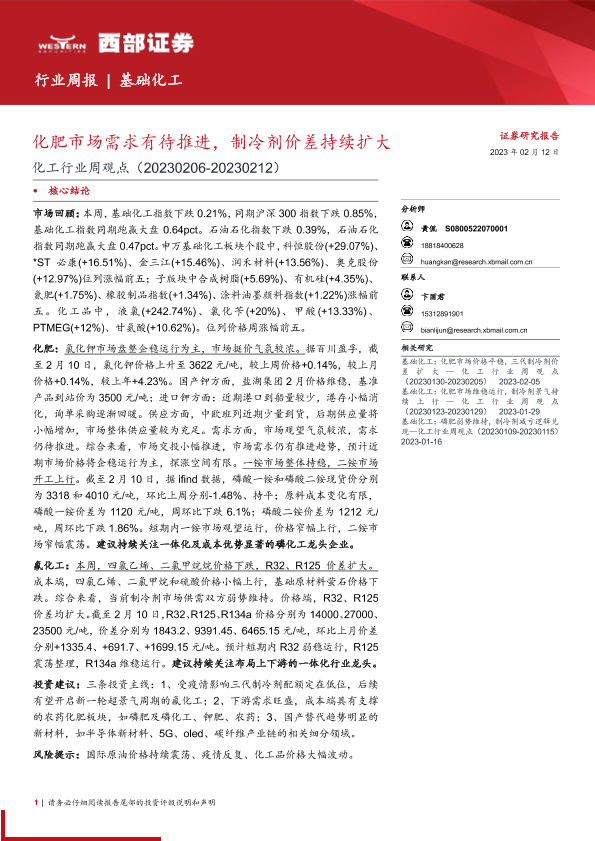 【西部证券】【20230212】化工行业周观点:化肥市场需求有待推进,制冷剂价差持续扩大-15页