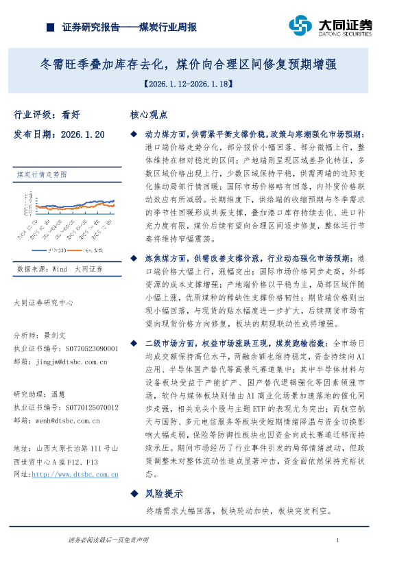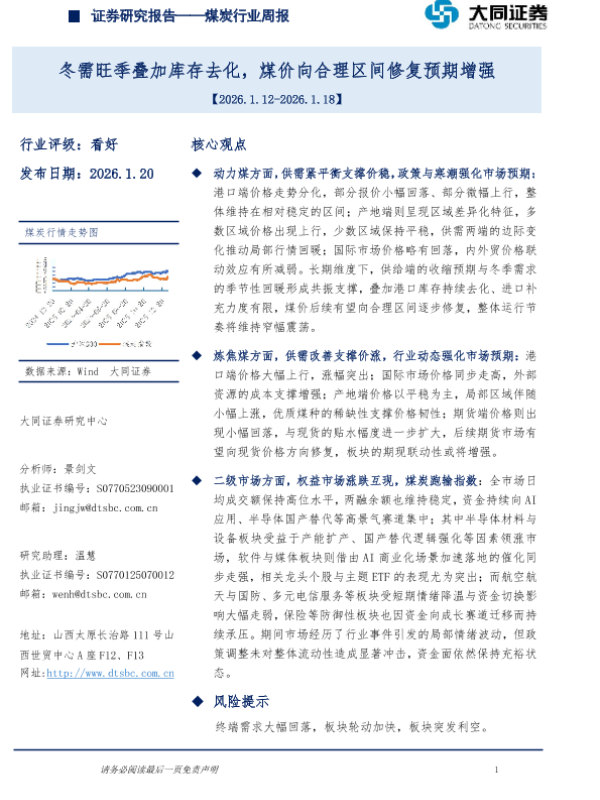 【大同证券研究中心】【202601】冬需旺季叠加库存去化,煤价向合理区间修复预期增强-14页