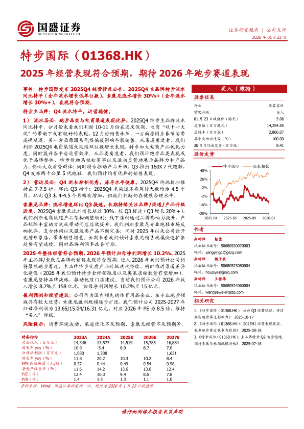跑步赛道 投资评级 特步国际 索康尼 盈利预测