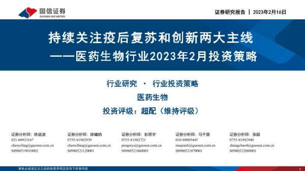 【国信证券】【20230216】医药生物行业2023年2月投资策略:持续关注疫后复苏和创新两大主线-31页