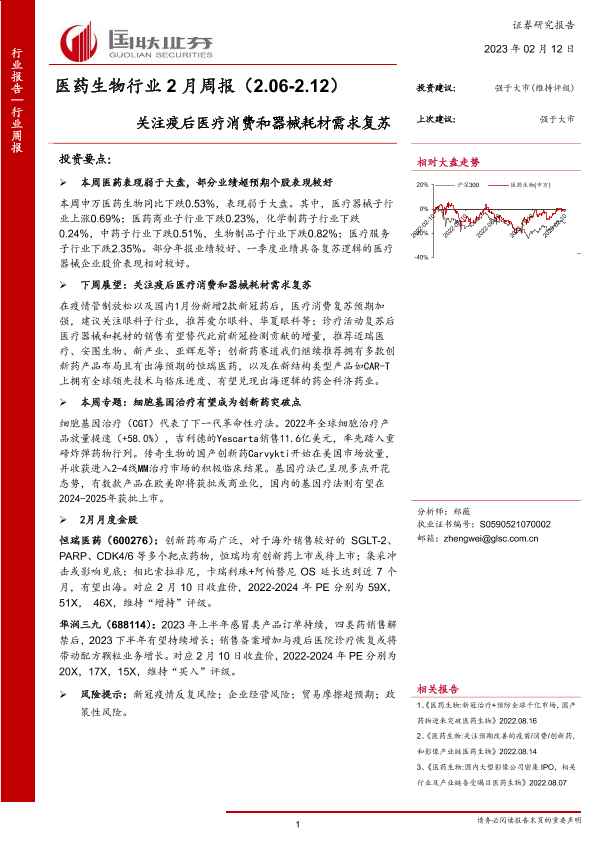 【国联证券】【20230212】医药生物行业2月周报:关注疫后医疗消费和器械耗材需求复苏-14页