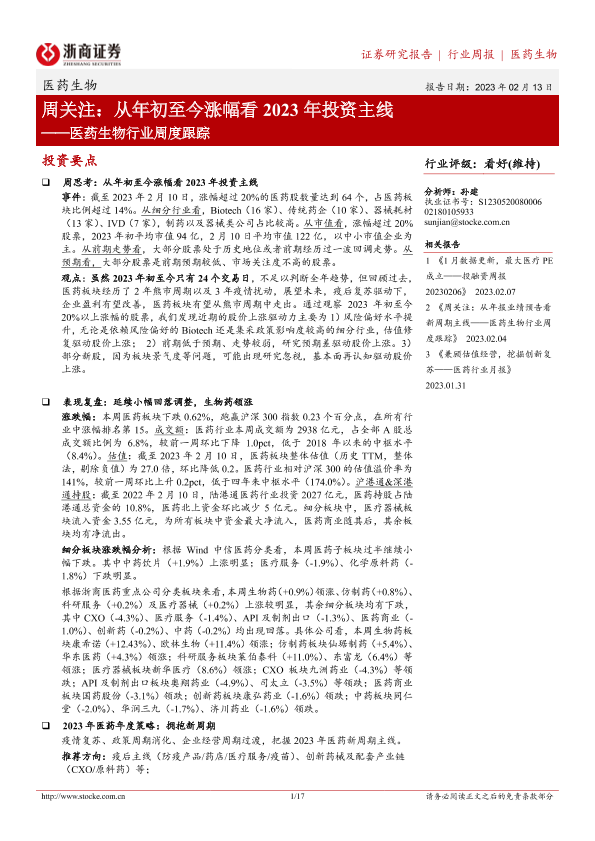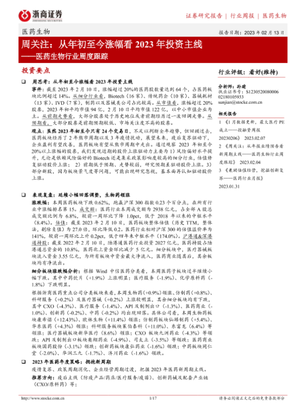 【浙商证券】【20230213】医药生物行业周度跟踪:周关注:从年初至今涨幅看2023年投资主线-17页