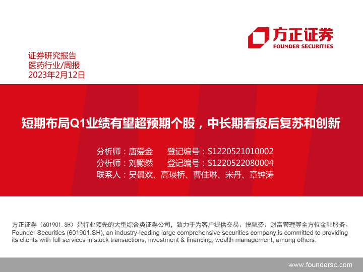 【方正证券】【20230212】医药行业周报:短期布局Q1业绩有望超预期个股,中长期看疫后复苏和创新-22页