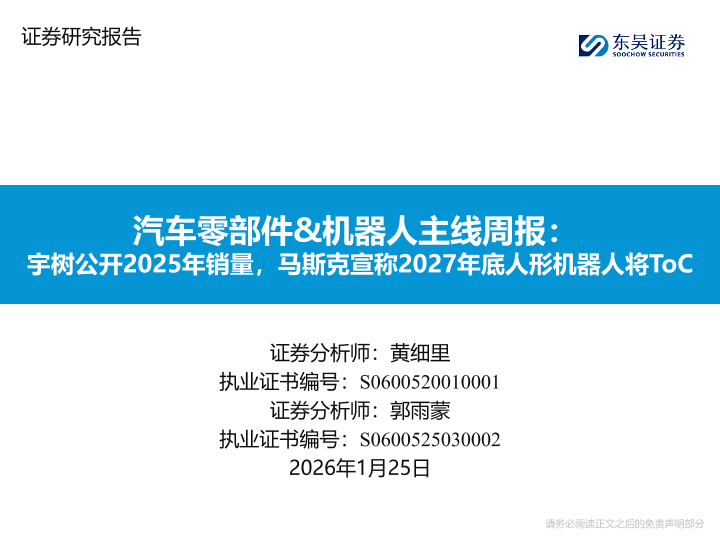 【东吴证券】【202601】汽车零部件&机器人主线周报:宇树公开2025年销量,马斯克宣称2027年底人形机器人将ToC-23页