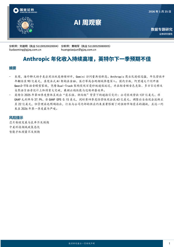 【国金证券】【202501】AI周观察:Anthropic年化收入持续高增,英特尔下一季预期不佳-7页