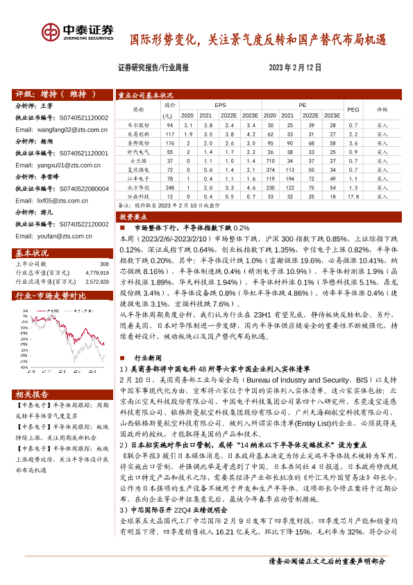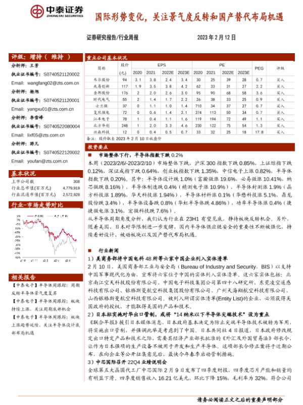 【中泰证券】【20230212】半导体行业周报:国际形势变化,关注景气度反转和国产替代布局机遇-15页
