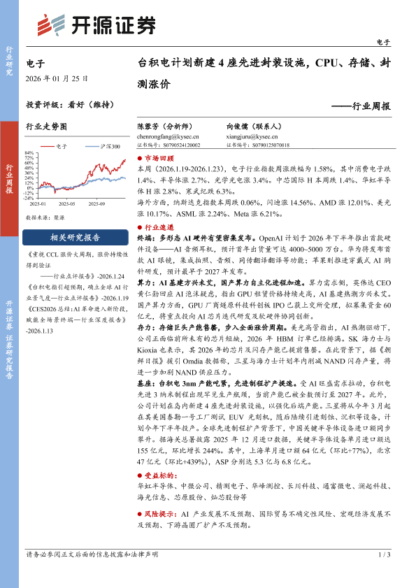 【开源证券】【202601】台积电计划新建4座先进封装设施,CPU、存储、封测涨价-3页