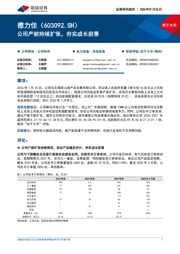 投资评级 风电 齿轮箱 产能扩张 订单充足