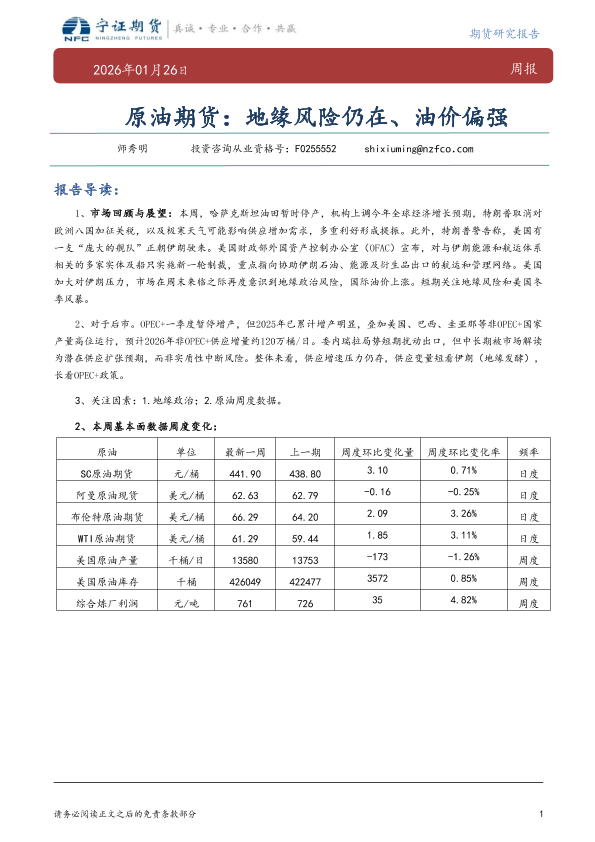 【宁证期货】【202601】原油期货:地缘风险仍在、油价偏强-7页