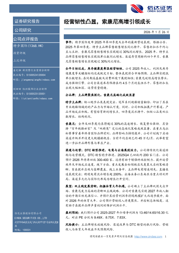 特步国际 索康尼 库存健康度 体育用品 盈利预测