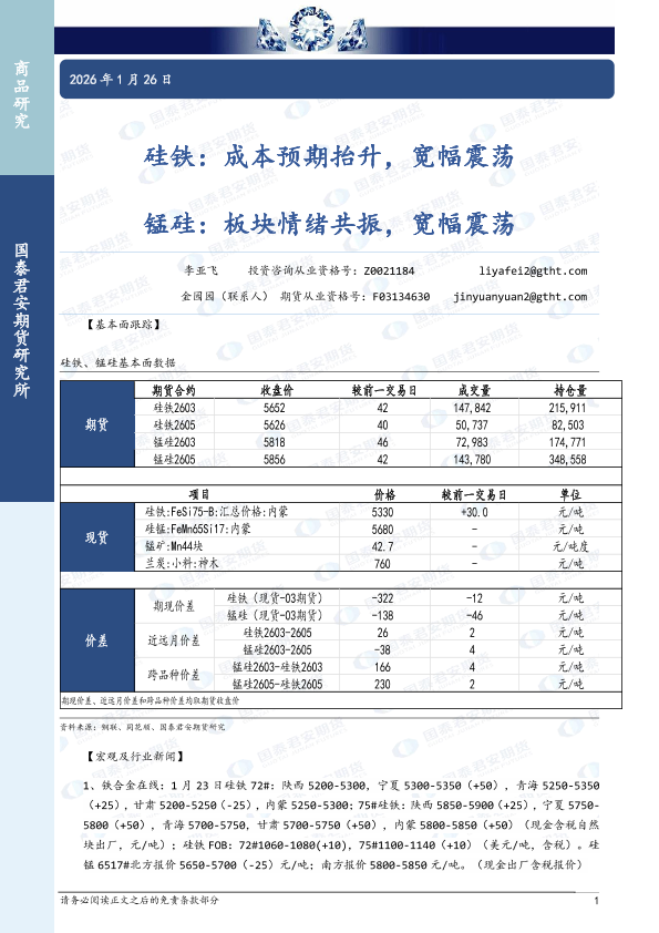 【国泰君安期货】【202601】硅铁:成本预期抬升,宽幅震荡 目泰君安期锰硅:·板块情绪共振,宽幅震荡-3页