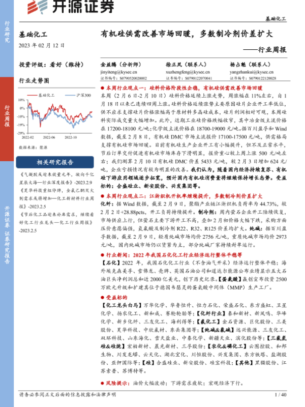 【开源证券】【20230212】基础化工行业周报:有机硅供需改善市场回暖,多数制冷剂价差扩大-40页
