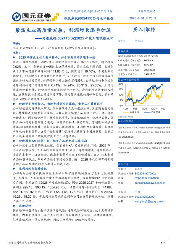 【国元证券】【202601】聚焦主业高质量发展,利润增长逐季加速——海康威视(002415.SZ)2025年度业绩快报点评-4页