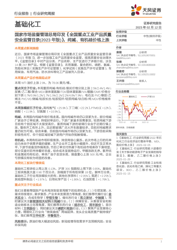 【天风证券】【20230212】化工行业研究周报:国家市场监督管理总局印发《全国重点工业产品质量安全监管目录(2023年版)》,纯碱、有机硅价格上涨-21页