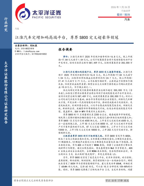 【太平洋证券】【202601】江淮汽车定增加码高端平台,尊界S800定义超豪华销冠-4页